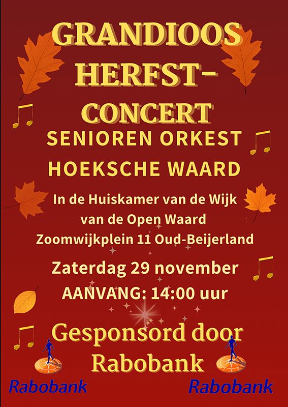 Herfstconcert Senioren Orkest Hoeksche Waard Het Senioren Orkest Hoeksche Waard, onder leiding van dirigent Chrétien Capello, geeft op vrijdag 29 november een sfeervol Herfstconcert in De... Lees verder
